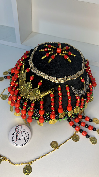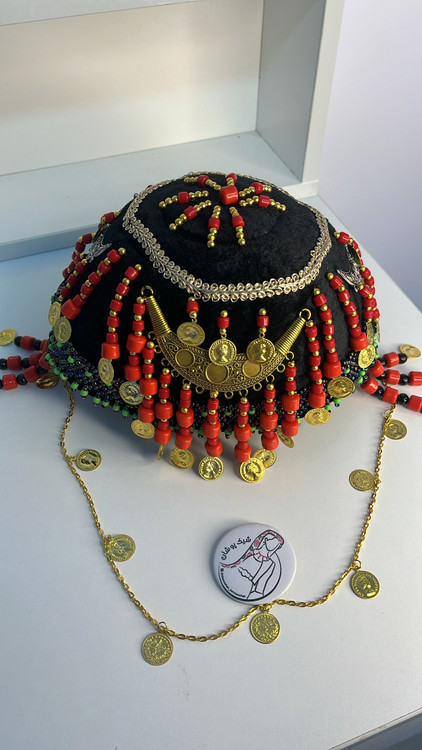 • دارای آویزهای بلند منجوقی قرمز رنگ در دور تا دور کلاه